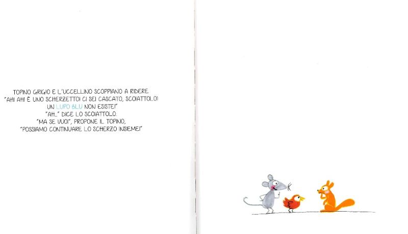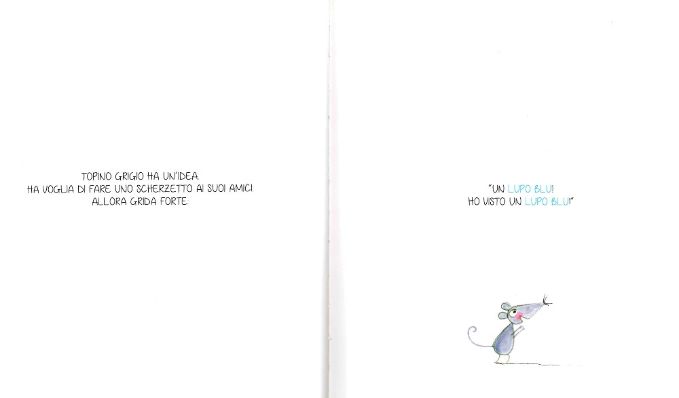 Topino grigio ha un’idea per movimentare la giornata, vuole fare uno scherzetto ai suoi amici e così grida forte: “Un lupo blu! Ho visto un lupo blu!”. Un lupo blu? I suoi amici, uno alla volta, vanno dal Topino per vedere questo strano lupo!