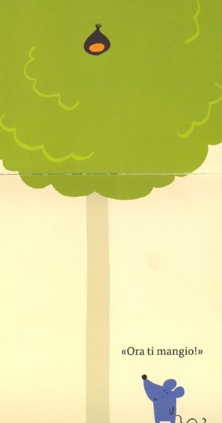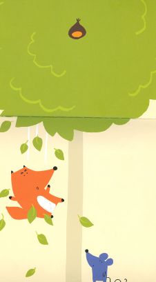 L’animale sta in basso, la castagna sta in alto: come riuscire nell’intento? Semplice: basta scuotere l’albero ma attenzione… ecco che oscilla da sinistra a destra e da destra a sinistra… scenderà la ghianda o un altro animaletto che si era arrampicato nella folta chioma dell’albero e che fino ad ora non avevamo intravisto? Il gioco del sali/scendi dall’albero di tutti questi animaletti crea un humor inaspettato dettato dalle poche semplici battute “ora ti mangio” che spingono il primo animale a rifugiarsi in alto per sfuggire alle grinfie del secondo animale più grosso!