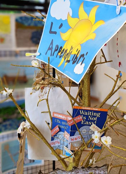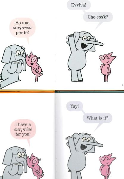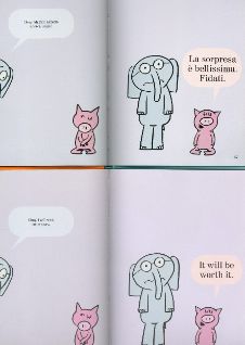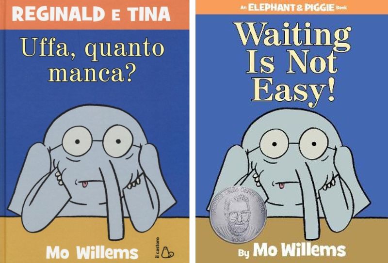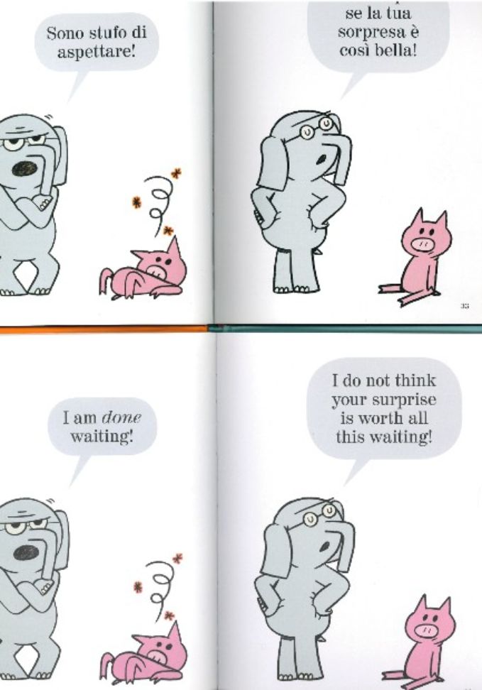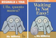Ecco, la sorpresa che abbiamo preparato per voi è che appesi al nostro albero dorato ci sono non uno, ma ben DUE libri!!! Stessa storia, stesse illustrazioni, due lingue diverse: “Uffa, quanto manca?” e “Waiting is not easy!” sapranno catturarci e farci ridere sia in italiano… sia in inglese, con le simpaticissime illustrazioni di Mo Willems!
