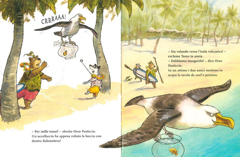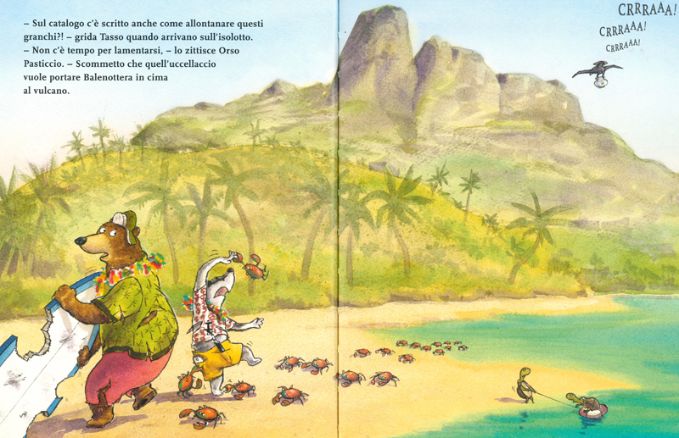 Nemmeno il tempo di preparare la loro amaca che un uccellaccio acchiappa al volo la boccia con dentro Balenottera per dirigersi verso l’isola vulcanica! A Tasso e Orso non resta che remare velocemente sulla loro tavola da surf per seguire il volo dell’uccello sfidando gli attacchi degli squali.