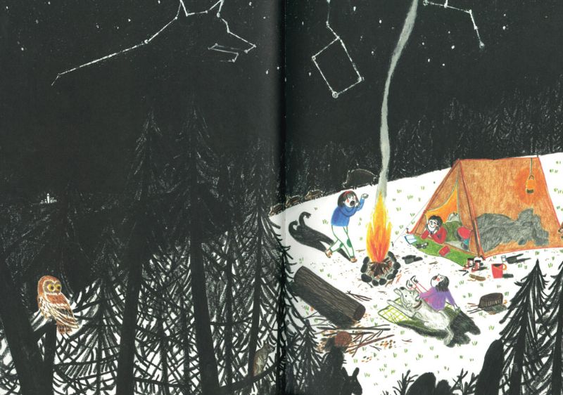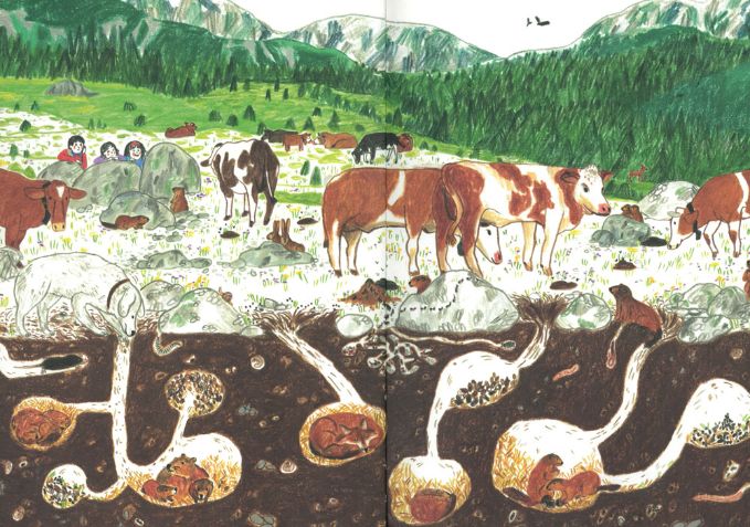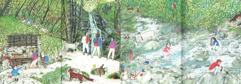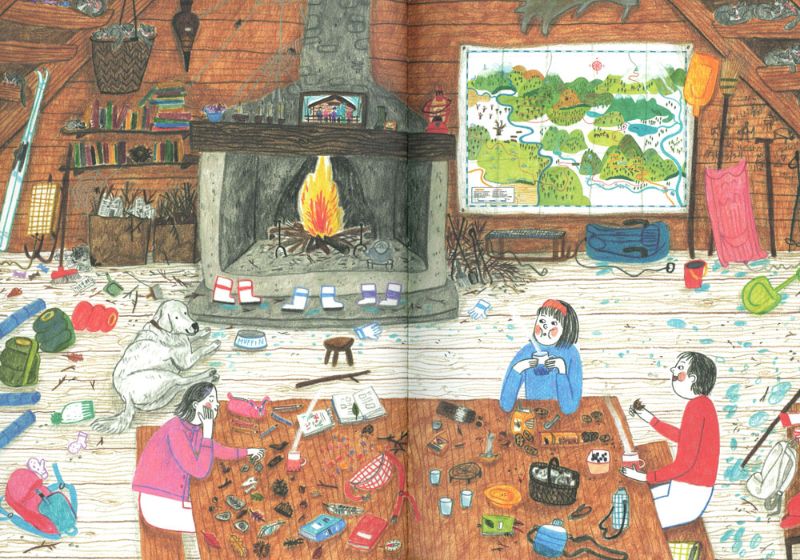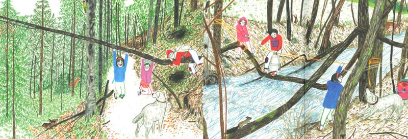 Irene Penazzi ci regala in “Su e giù per le montagne” un percorso da seguire insieme ai tre ragazzini protagonisti tra passeggiate tra camosci e marmotte, notti in tenda sotto le stelle, giochi all’aria aperta, picnic in riva al lago e baite dove rifugiarsi se fuori il maltempo imperversa. I ragazzini sembrano divertirsi alla grande, ogni giorno per loro una scoperta e se sentono nostalgia dei parchi gioco cittadini, quale soluzione migliore se non quella di utilizzare tronchi d’albero orizzontali per dondolarsi o per attraversare (senza cadere!) un torrente?!