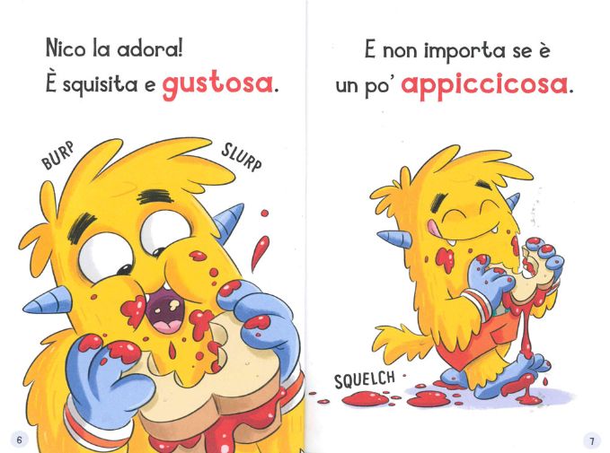 Pensate che in questo episodio dal titolo “Nico fa abbuffata di pane e marmellata” Nico, uno dei piccoli mostri, super ghiotto di marmellata, impiastriccia col suo panino tutta la scuola!