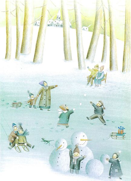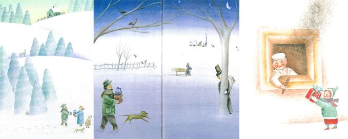 Il guardaboschi incontrando il timido spazzacamino lo regala a lui, che poi lo consegna a una bambina ammalata, poi lo trovano gli amici della bambina che lo passano al panettiere che aveva appena bruciacchiato il lavoro di una notte intera… insomma questo pacchetto passa di mano in mano tra gli abitanti del paese ma mai a caso perché chi lo riceve ha poi il pensiero di donarlo a chi, in quel momento, sembra averne più bisogno.