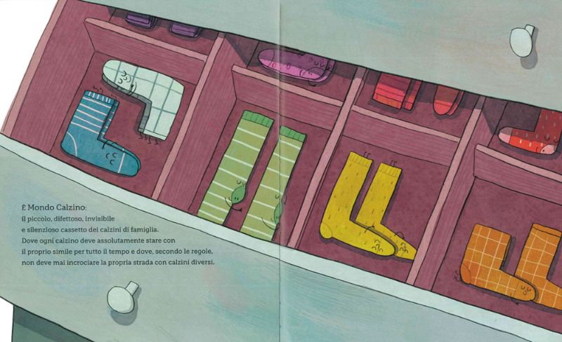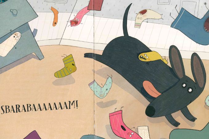 Lo hanno imparato anche i protagonisti del libro di oggi, “Mondo Calzino”, quando la loro quotidianità viene messa a repentaglio dal cane Senape che… SBARABAAM!! Con un salto fa cadere il cassetto dove, appaiati, stavano riposando i nostri amici calzini.
