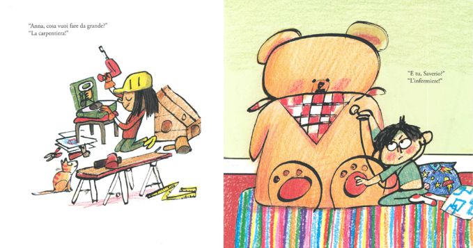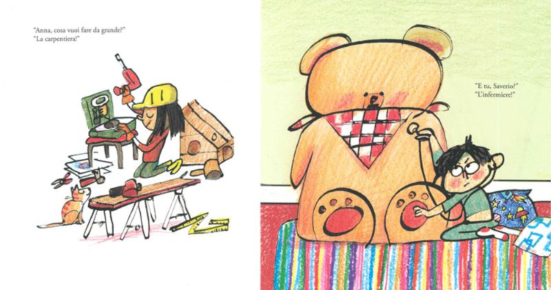 Da grande Anna vuol fare la carpentiera e Saverio l’infermiere. A Paolo stanno benissimo i capelli lunghi, Giulio può commuoversi per un film e Laura può essere orgogliosa di essere un asso negli scacchi. Daniela ha fatto una puzzetta e non si deve sentire in imbarazzo, mentre Matteo ha chiesto a Babbo Natale una bambola e una macchina telecomandata: perché scegliere se si possono avere entrambi? Silvia è fortissima a calcio, ma a volte preferisce cucinare con Dario.