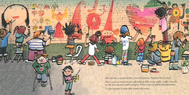 Alle bambine e ai bambini femministi non importa di sporcarsi o spettinarsi, perché per loro l’importante è divertirsi e giocare insieme! Non esistono né mestieri né tagli di capelli da maschio o da femmina. I bambini e le bambine vogliono scegliersi i loro vestiti e i loro giocattoli, e non si vergognano di esprimere le proprie emozioni.