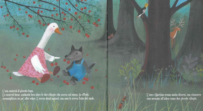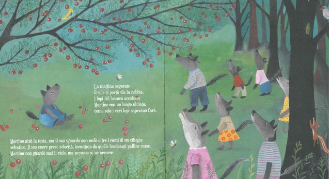 Ma Martino quando guarda in alto non vede la luna, ammira invece le rosse ciliegie che pendono dagli alberi sopra di loro. A lupetto piacciono così tanto le ciliegie che mettersele sul musetto lo rende davvero contento.