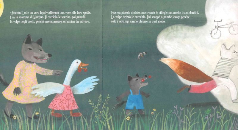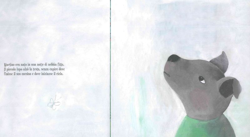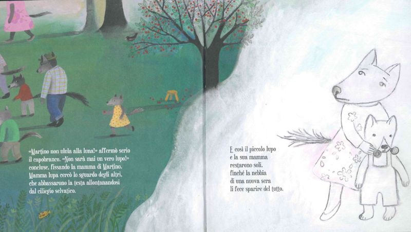 Un bel giorno di fitta nebbia però, Martino incontra un’oca spaventata e, grazie al suo ululato da vero lupo mette in fuga una volpe affamata e protegge la sua nuova amica. L’ululato da vero lupo infatti non dev’essere per forza alla luna! Così come non ululare affatto non lo rende meno lupo degli altri.