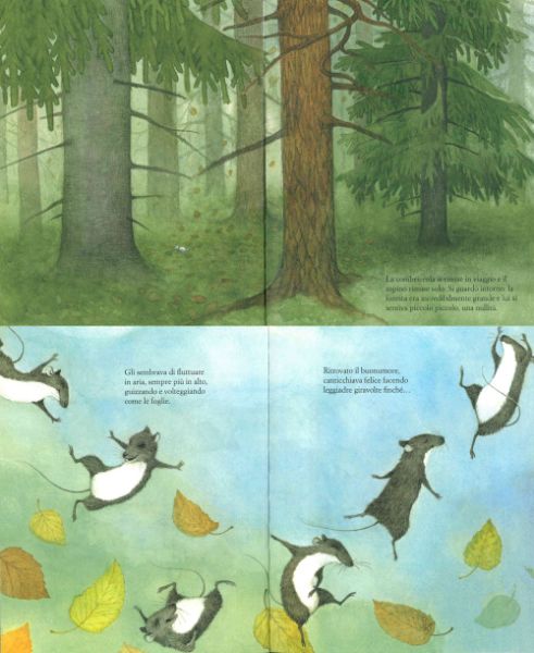 Sembrano tutti emozionati, ma qualcuno non è affatto contento: il topino della foresta, poverino, non è riuscito a raccogliere nemmeno un fungo e quindi non ha voglia di festeggiare. Mogio mogio decide di allontanarsi dai suoi amici ma rimanendo solo nella grande foresta si sente una nullità. Le foglie colorate cadono dagli alberi e gli svolazzano intorno: wow, sembrano danzare guidate dal vento!