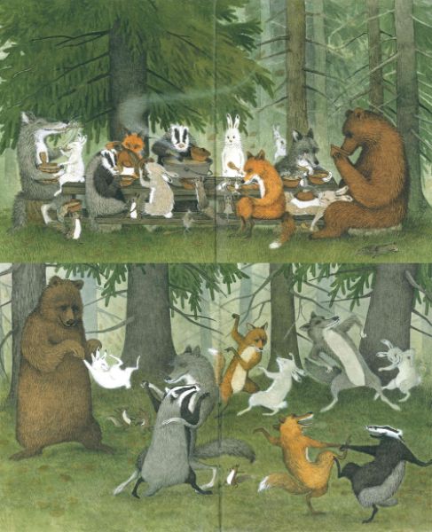 Topino è sempre più sereno, tanto che decide di seguire la sua amica lepre alla festa: il malumore della giornata è ormai solo un brutto ricordo e, insieme ai suoi amici, il nostro piccolo topolino guarda gli altri animali ballare, divorando la sua zuppa di funghi e ridendo a crepapelle.