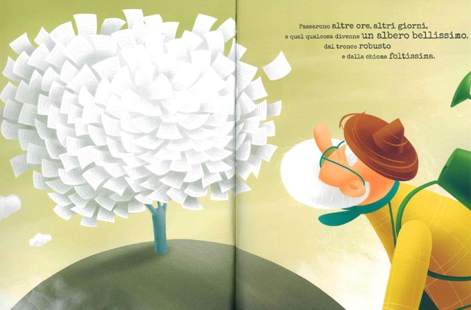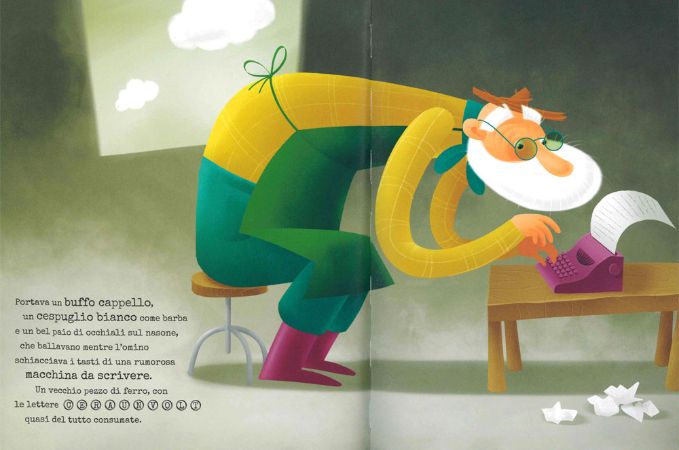 “Il giardiniere dei sogni” è un omino vecchio di cui non si ricorda più nemmeno l’età che vediamo intento a battere i tasti ormai consumati della sua vecchia macchina da scrivere. Il foglio su cui scrive lo sotterra nel posto che ritiene più adatto per potersene prendere cura, coltivarlo, annaffiarlo, accudirlo amorevolmente finché da quel foglio possa nascere un albero pieno zeppo di fogli scritti che danno vita a uno, due, cento, mille volumi popolati da storie e creature fantastiche, capaci di raggiungere ogni lettore in grado di coglierne la magia.