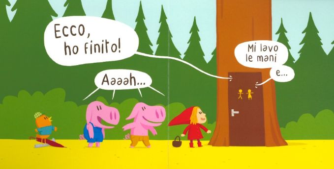 Poco dopo arriva un maialino ma anche lui deve aspettare. «È urgente!» urla un secondo maialino ma non ha altra scelta se non quella di mettersi in coda. «Io vado!» dice l’uccellino, però gli altri gli dicono che, purtroppo, c’è da aspettare. Nel frattempo chi sta occupando il bagno sembra non avere particolare fretta di lasciarlo libero, e infatti lo sentiamo dire “2 secondi che mi rimetto le mutande!” e, di lì a poco, “tiro su i pantaloni, mi lavo le mani e…” Tutti quanti sono ormai davvero spazientiti, eppure quando finalmente la porta si apre… «Ahhhhhhh!!!»