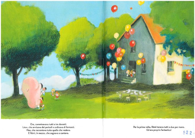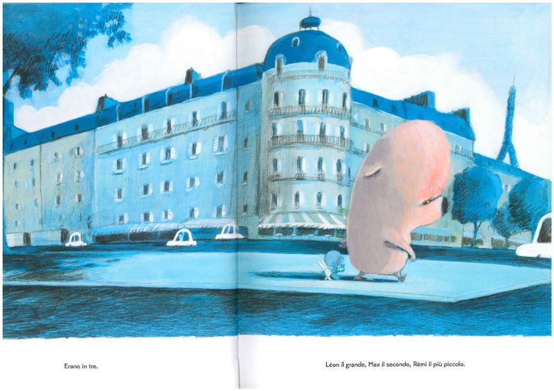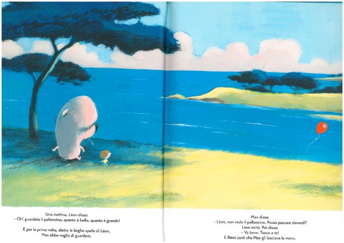 Questo è ciò che accade ai protagonisti di questo grande albo: Leon il più grande, Max il secondo, Rémi il più piccolo. Leon, un grande cagnolone rosa, cammina sempre davanti, il suo compito infatti è di difendere i due amici più piccoli descrivendo loro ciò che vede. Max è un bimbetto che stringe tra le mani un pacchetto regalo e Rémi è un piccolo coniglietto bianco. Max e Rémi stanno sempre dietro le grandi spalle di Leon e, così, dietro di lui, si sentono bene.
