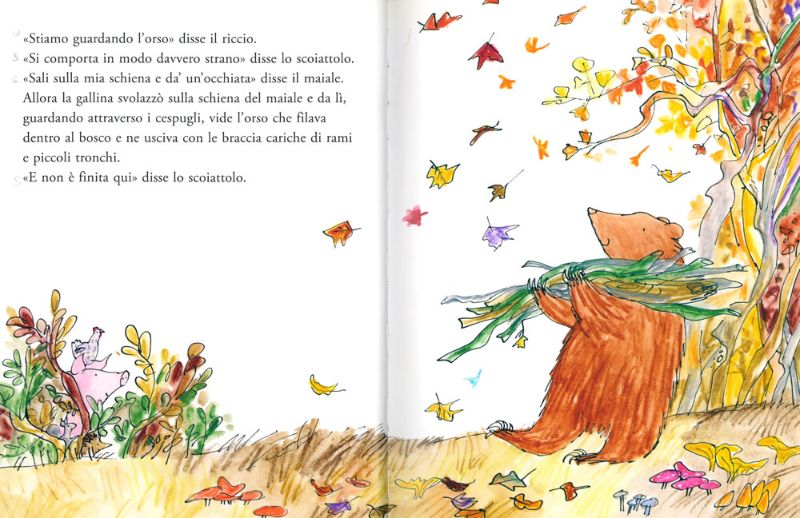 Orso però si sta comportando in modo assai strano: i suoi amici, una gallina uno scoiattolo un riccio e un maiale, sbirciano tra i cespugli il loro amico con le braccia cariche di rami, piccoli tronchi e morbido muschio. Ma che sta combinando?