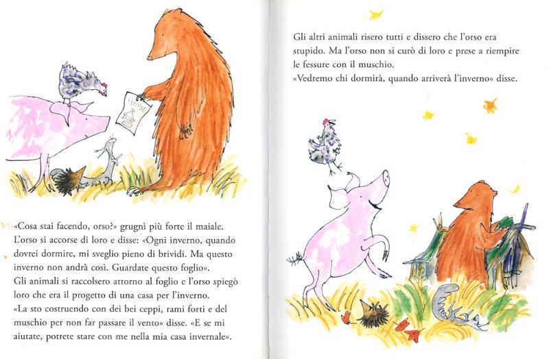 La curiosità ha la meglio e i piccoli animaletti sbucano fuori dal loro nascondino per chiedere spiegazioni a orso che inizia a dire: “Ogni inverno, quando dovrei dormire, mi sveglio pieno di brividi. Ma questo inverno non andrà così. Guardate questo foglio.”, e mostra loro il progetto di una casa invernale.