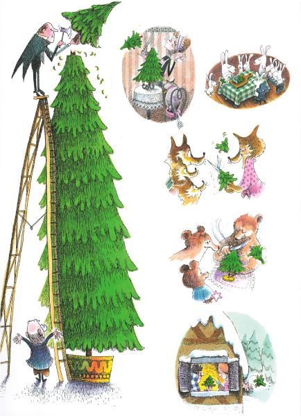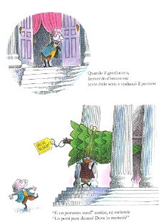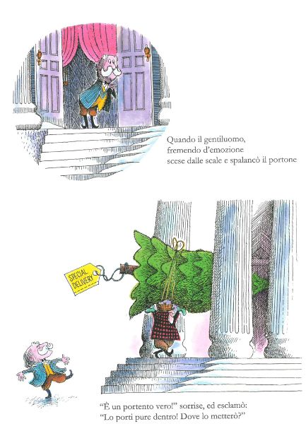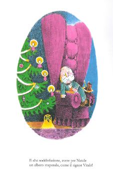 Il leitmotiv della storia diviene proprio questo: ogni volta che la punta del nuovo alberello viene recisa e scartata o donata, immediatamente una nuova famiglia gioisce per l’alberello inaspettato che andrà a decorare la sua casa accorgendosi però, una volta sistemato, che è troppo alto e che quindi necessita di una nuova accorciatina! E avanti così fino a quando l’alberello, ormai divenuto piccolissimo, è l’albero perfetto, anzi il migliore, che potesse desiderare una famiglia di piccoli topolini che abitavano… sapete dove?, proprio nella maestosa dimora del signor Vitale!
