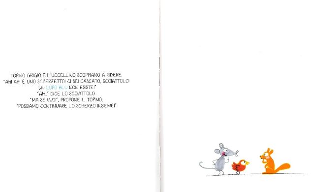 Ma ecco che Topino scoppia in una fragorosa risata svelando agli amici di essersi divertito a prenderli un po’ in giro! Ma che succede se mentre gli amici sono lì che se la ridono, arriva davvero un lupo blu? Ma allora esistono davvero i lupi blu? O anche il lupo, preso dallo spirito carnevalesco, ha ben pensato di travestirsi per fare a sua volta un bello scherzetto a tutti? E se lo scherzo poi non finisse lì?