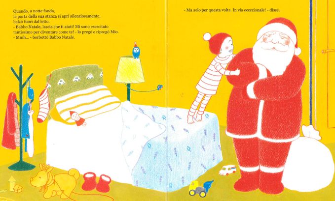 Mio, il protagonista di oggi ne “L'aiutante di Babbo Natale” esaudisce il desiderio di tutti i bimbi e riesce a svegliarsi nel cuore della notte mentre Babbo silenziosamente stava entrando nella sua camera per lasciargli il regalino… “Babbo Natale, lascia che ti aiuti! Mi sono esercitato tantissimo per diventare come te!”
