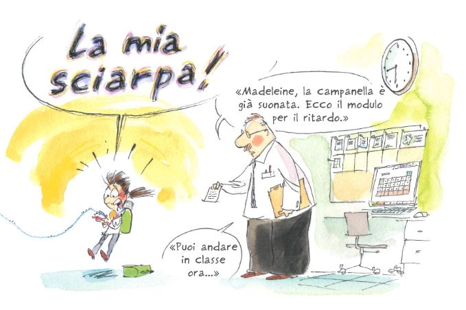 Madeleine ne è felicissima ma un piccolo imprevisto le capita appena esce di casa per correre a scuola, avvolta dal caldo abbraccio di questa lunghissima sciarpa: senza accorgersene un filo rimane impigliato nella porta e la sciarpa inizia a sfilarsi passo dopo passo… ahimè! Che fare?