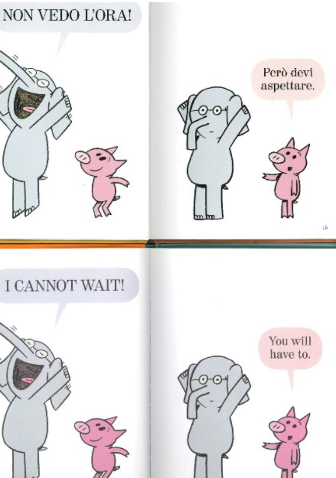 Ecco, la sorpresa che abbiamo preparato per voi è che appesi al nostro albero dorato ci sono non uno, ma ben DUE libri!!! Stessa storia, stesse illustrazioni, due lingue diverse: “Uffa, quanto manca?” e “Waiting is not easy!” sapranno catturarci e farci ridere sia in italiano… sia in inglese, con le simpaticissime illustrazioni di Mo Willems!