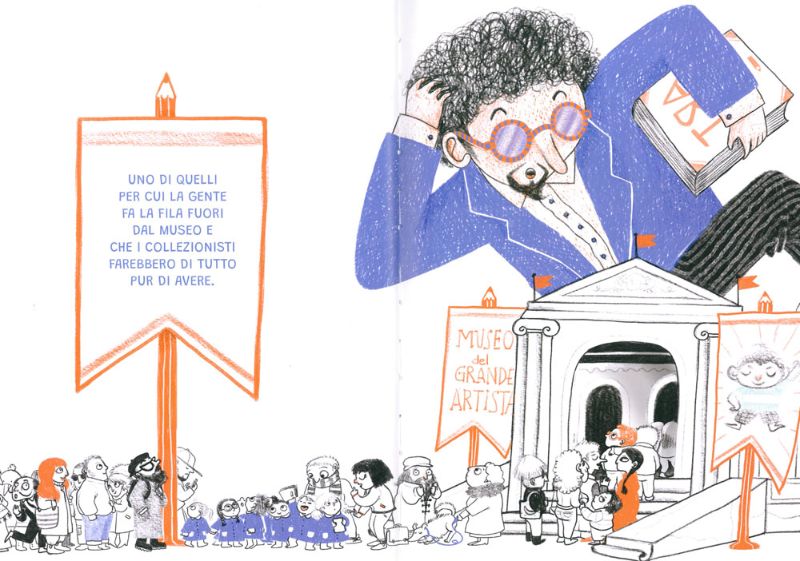 Max, il ragazzino protagonista di questo albo illustrato, ha un sogno nel cassetto: diventare un grande artista e già si vede che sarà “uno di quelli per cui la gente fa la fila fuori dal museo”. Così quando la maestra affida come compito per casa la realizzazione di un disegno a tema libero, Max non sta nella pelle: finalmente è arrivata la prima vera occasione di dimostrare tutto il suo talento…