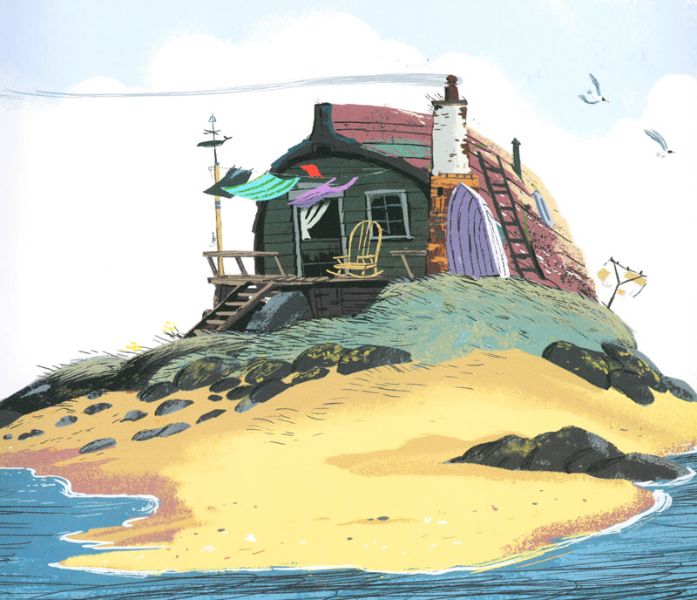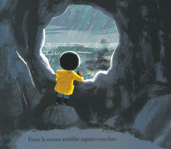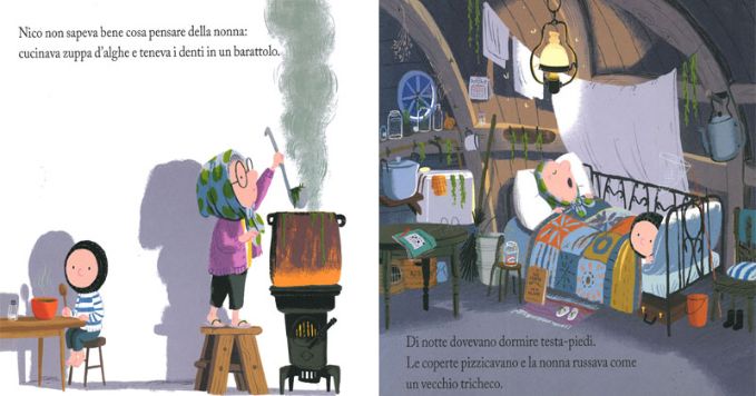 Questa nonnina eclettica sembra non aver molto tempo da dedicare a Nico, giochi e divertimenti non si incastrano con tutti i suoi ritmi e così Nico, con il suo impermeabile giallo, la sua cuffietta nera e la maglia a righe, può esplorare l’isola deserta come meglio crede.