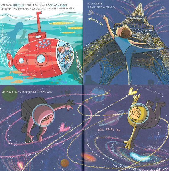 Come si fa a dormire al sicuro quando tra loro e la mamma ci sono addirittura delle pareti di mezzo?! La mamma allora spiega che in realtà lei è sempre con loro perché ad unirli c'è il filo invisibile.
