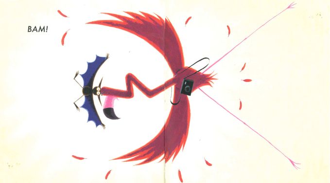 L’uccello in questione è Flamingo, un fenicottero molto gentile che si offre di riaccompagnarlo a casa. Arrivati a destinazione Bat invita il suo nuovo amico a casa.