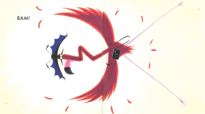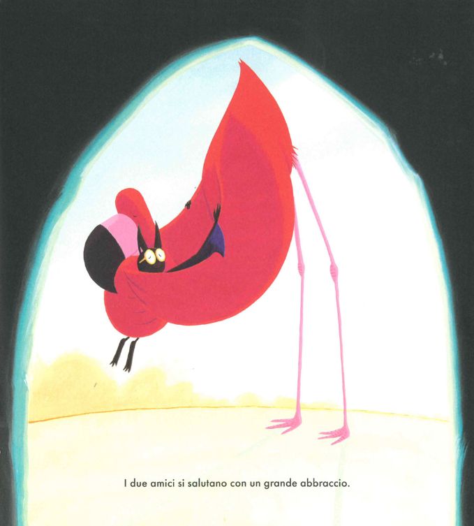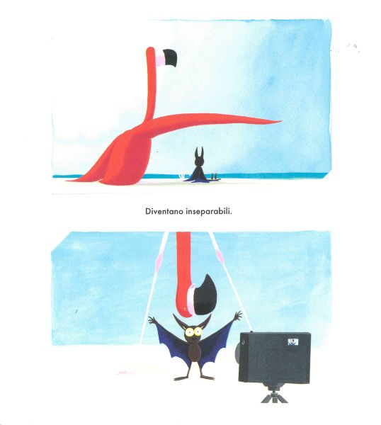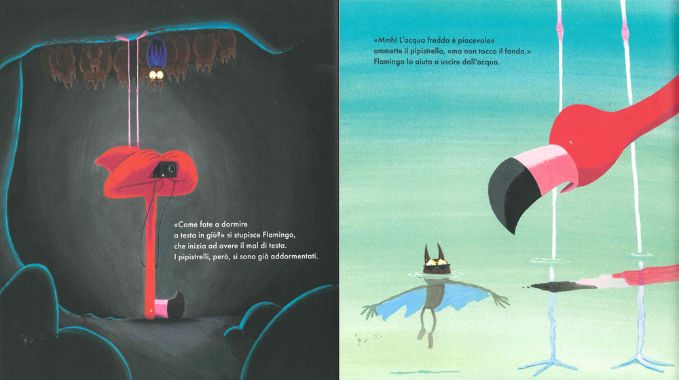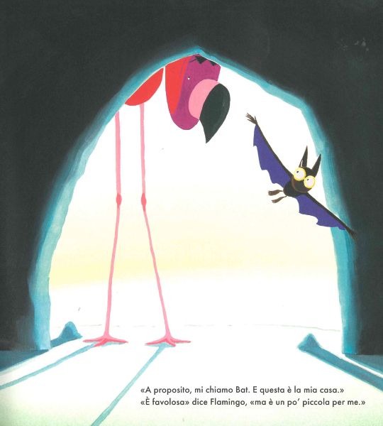 In “Bat e Flamingo”, Bat è un pipistrellino che, come tutti i pipistrelli, passa gran parte del tempo al buio. Un giorno però, stufo di quell’oscurità decide di fuggire dalla sua caverna e BAM!!! incontra, o meglio, si scontra con un uccello così maestoso e dai colori così sgargianti che ne rimane sbalordito.