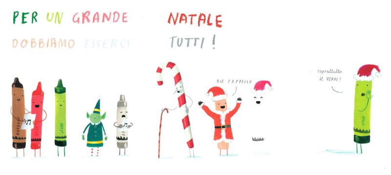Ci sta venendo un dubbio però e qui non riusciamo mica a metterci d’accordo… vediamo se voi riuscite a darci una mano: il Natale di che colore è? Come dite? Rosso come il vestito di Babbo? E perché non verde come gli abeti o marrone come Rudolf? Forse la soluzione la troviamo nel libro di oggi, “Verde è il colore di Natale” dove dei buffosissimi colori a cera con simpatici berretti natalizi iniziano un divertente battibecco su chi tra loro possa considerarsi il re dei colori del Natale!