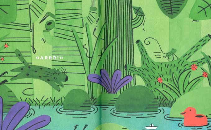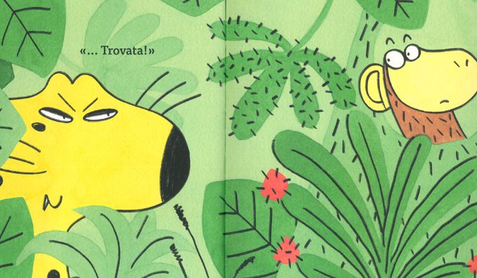 Proprio come si divertono i protagonisti del libro di oggi! Tutto comincia con un inseguimento mozzafiato: il ghepardo trova la scimmietta, la scimmietta allora corre, si arrampica sugli alberi, insieme attraversano la foresta, “arrr!”, superano lo stagno, SCAPPA SCIMMIETTA SCAPPA, il ghepardo si avvicina, la scimmietta è in trappola, “E ADESSO…”?