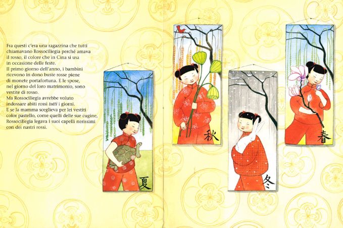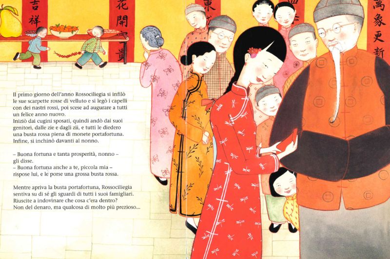 Tanto tempo fa, in questo posto lontano, Rossociliegia abitava con tutta la famiglia nella grande casa del nonno. La bambina la chiamavano così perché amava il rosso e le piaceva indossarlo in ogni occasione, non solo a Capodanno come voleva la tradizione, e poi, dove abitava Rossociliegia il colore rosso simboleggiava fortuna, felicità, ricchezza. Era il colore delle buste piene di monetine portafortuna che venivano consegnate ai bambini il primo giorno dell’anno e anche quello degli abiti da sposa.