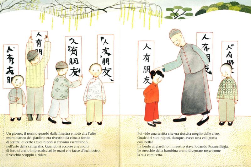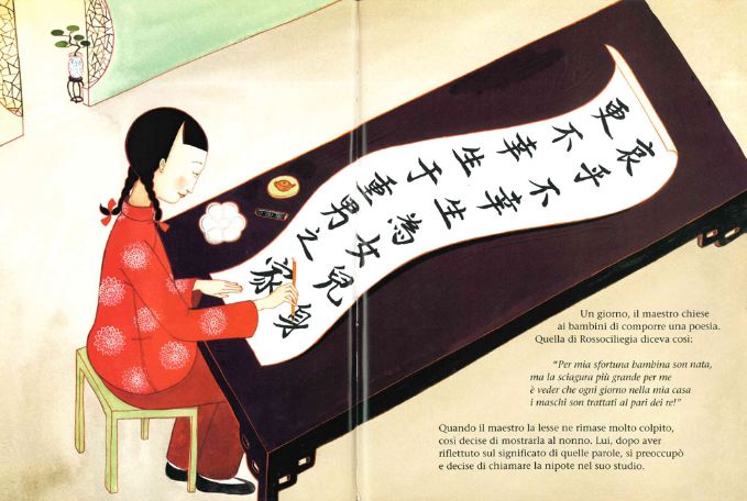 Un giorno però il nonno la mandò a chiamare per chiederle il significato di una poesia che aveva scritto a lezione, recitava così: “i maschi son trattati al pari dei re!”. Rossociliegia non ebbe paura di dire a nonno ciò che oramai per lei era più che evidente: ai maschietti della famiglia venivano destinati i migliori trattamenti e soprattutto, a loro, era permesso andare all’università! Proseguire gli studi universitari era il sogno di Rossociliegia ma sapeva bene che il suo destino sarebbe stato un altro. Arrivò il primo giorno dell’anno e il nonno le regalò una busta rossa, come da tradizione, ma ciò che la ragazzina non poteva sapere era la grande sorpresa contenuta dentro…