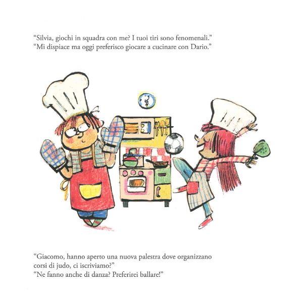 Da grande Anna vuol fare la carpentiera e Saverio l’infermiere. A Paolo stanno benissimo i capelli lunghi, Giulio può commuoversi per un film e Laura può essere orgogliosa di essere un asso negli scacchi. Daniela ha fatto una puzzetta e non si deve sentire in imbarazzo, mentre Matteo ha chiesto a Babbo Natale una bambola e una macchina telecomandata: perché scegliere se si possono avere entrambi? Silvia è fortissima a calcio, ma a volte preferisce cucinare con Dario.