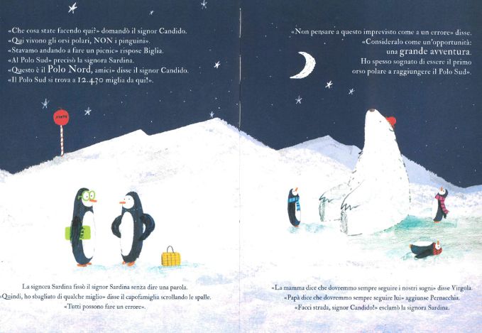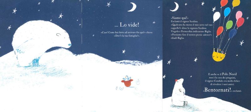 Tuttavia un giorno, mentre stanno andando a fare un picnic, i Sardina si ritrovano in un luogo sconosciuto… Accidenti! Dove sono finiti i nostri piccoli amici?! La risposta è pronto a dargliela un abitante del luogo, il signor Candido, un enorme orso polare con un simpatico cappellino rosso. Il signor Candido avvisa i pinguini del fatto che evidentemente si sono persi perché sono finiti nientepopodimeno che… al Polo Nord, a ben 12.340 miglia da casa loro!!!