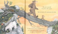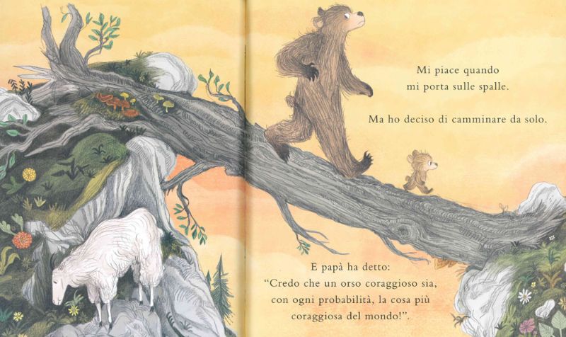 Le rocce sono scivolose e orsetto, troppo audace e poco prudente, cade e si fa male a un ginocchio. Ma un orso coraggioso come lui decide comunque di proseguire il suo cammino, e insieme al suo papà raggiunge il fiume.