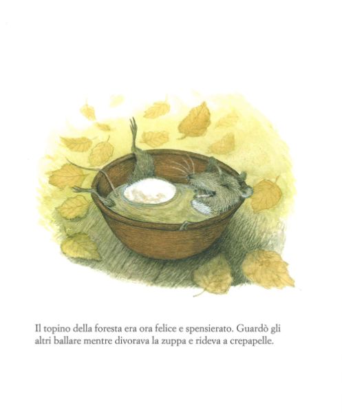 Topino è sempre più sereno, tanto che decide di seguire la sua amica lepre alla festa: il malumore della giornata è ormai solo un brutto ricordo e, insieme ai suoi amici, il nostro piccolo topolino guarda gli altri animali ballare, divorando la sua zuppa di funghi e ridendo a crepapelle.