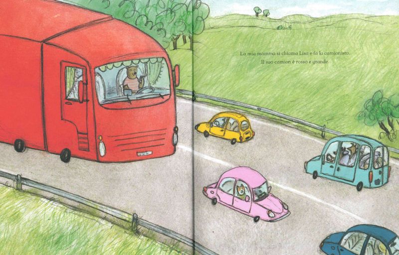 Si chiama Lisa e ha un grandiiissimo camion rosso. Forte vero? Il papà della piccola orsetta invece si chiama Gigi ed è un maestro d’asilo: legge le storie ai bambini e gli fa fare un sacco di lavoretti. Durante la settimana mamma orsa percorre molti chilometri lontana da casa, ma il venerdì sera torna, e papà orso prepara un buonissimo budino alle arance per accoglierla.