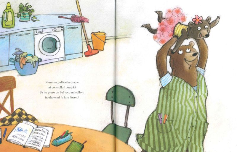 Certo, a orsetta manca mamma Lisa, non la vede per tanti giorni, ma c’è papà Gigi con lei, e il weekend lo passano tutti e tre insieme! Il sabato e la domenica mamma Lisa ripara qualunque cosa ci sia da riparare e aiuta orsetta con i compiti, mentre papà Gigi le insegna ad andare in bicicletta e va a fare le spese.