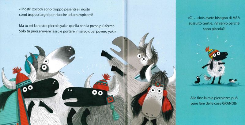 Pensate un po’, solo Gertie è in grado di salvare un piccolo piccolissimo yak! Dunque, cari piccoli lettori, questa eroina ci insegna una cosa molto importante: ci sono cose che solo i più piccoli possono fare, e che non c’è alcuna fretta di diventare grandi.