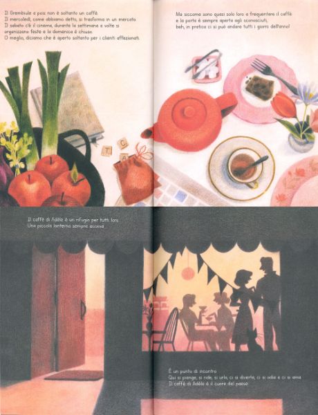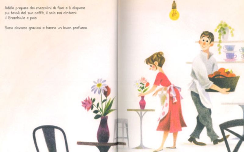 Adèle è una giovane donna solare che si occupa con tanto amore del suo caffè. E in effetti le cure amorevoli e l’attenzione anche verso i più piccoli dettagli, rendono il caffè di Adèle un mondo vivace, capace di vestirsi anche con gli abiti di un cinema o con quelli di un mercato di frutta e verdura, è luogo di chiacchiere e di ritrovi, di festa.