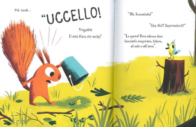 I problemi però iniziano quando Scoiattolo cerca di salvaguardare il fiorellino per paura che possa “scappare” come avevano fatto le sue foglie in autunno… inutili i tentativi di Uccello di dissuaderlo dalle sue intenzioni!