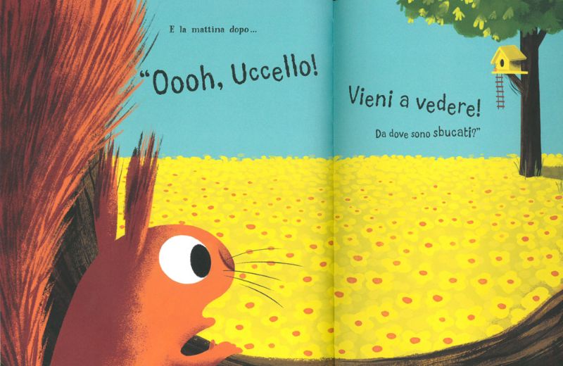 Le illustrazioni semplici ma vivaci e colorate danno il ritmo ad una lettura vivace, veloce, divertente che ben si presta a essere letta da due voci! Che dirvi ancora?! Vi aspettiamo in biblioteca in compagnia di Uccello e Scoiattolo!
