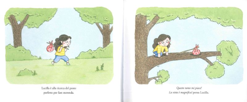 In una bella giornata di sole Lucilla cerca il posticino ideale per fare merenda e, dopo essersi arrampicata su un albero, trova un comodo ramo con una vista meravigliosa.