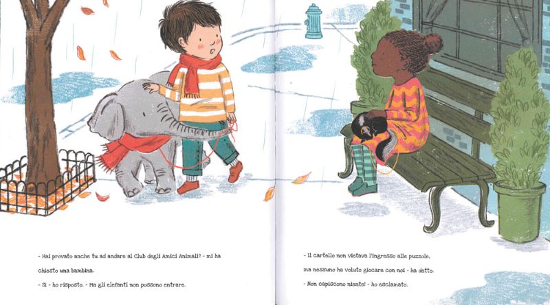Certo, non sono in molti ad avere un elefantino come animale domestico, ma escluderlo così è davvero poco gentile… perciò i due amici, sconsolati, se ne vanno.