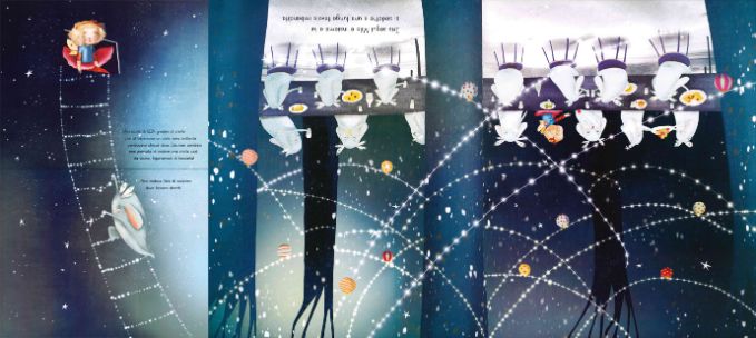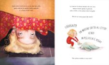 Non abbiate paura, bimbi! Il nostro mostriciattolo è un simpatico esserino un po’ particolare: quando parla, le parole gli escono da bocca a testa in giù! Vi diamo un consiglio: provate a ruotare il libro di 180° e… vedrete la magia!