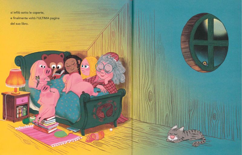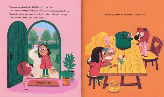 A quanto pare ha finito il porridge ed è piuttosto affamata! Orso la fa entrare per offrirgliene un po’, poi torna a letto veloce come un fulmine, apre il suo libro ma… TOC TOC! Ancora?? Orso corre alla porta, e non può non far entrare Cappuccetto Rosso… dopotutto, il lupo le ha mangiato di nuovo la nonna, poverina!