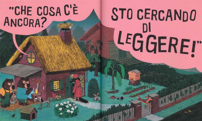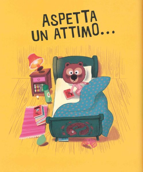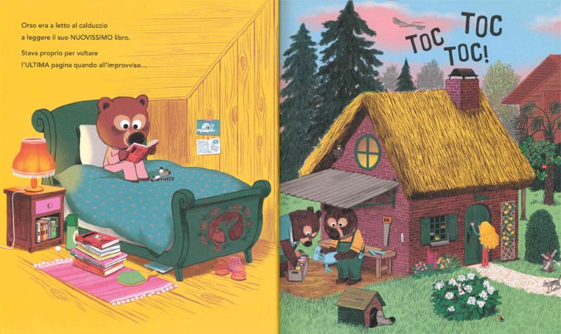 Il nostro amico Orso se ne sta comodo comodo a letto, intento a leggere il suo nuovissimo libro. Gli manca solamente una pagina per finirlo: potete immaginare la curiosità e l’emozione! Sta proprio per girarla quando… TOC TOC!! O la vista mi inganna, o la ragazza alla porta è: Riccioli d’oro!