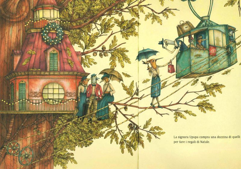 Le illustrazioni di Marco Somà ci fanno entrare in un mondo incantevole già dalla copertina, con questa quercia che diventa albero-casa illuminata da calde lucine in una serata estiva, per poi ammirare, pagina dopo pagina, la ricchezza dei suoi disegni così minuziosi e particolareggiati da diventare quasi uno studio naturalistico e una vera e propria opera d’arte nello stile con cui riveste le case.