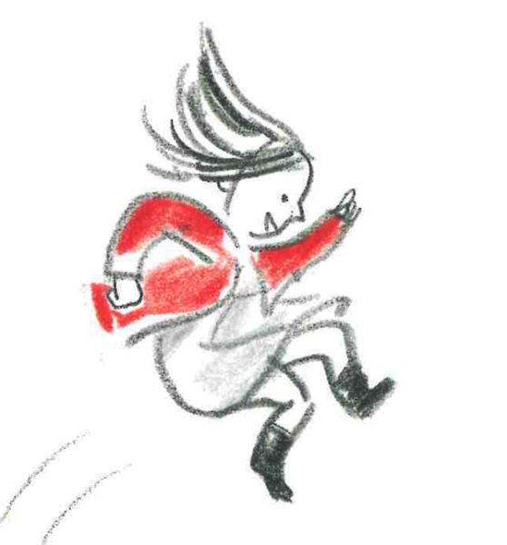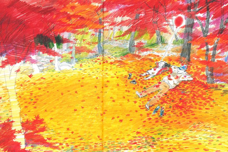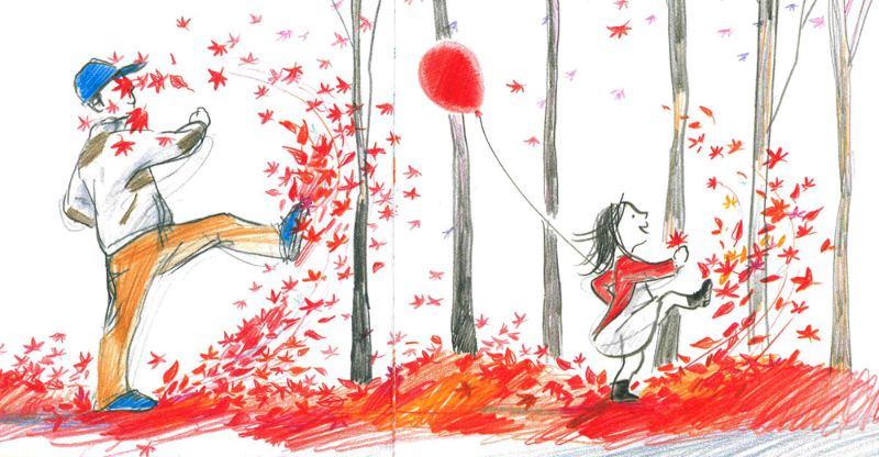 La storia inizia già prima del frontespizio, appena voltiamo la copertina, quando vediamo il papà indossare il berretto e la bimba infilarsi il suo cappottino rosso e prosegue sul frontespizio dove la bimba, piena di emozione e felicità per la giornata che la attende, salta veloce giù dai gradini mentre il papà si attarda ad allacciarsi le scarpe, per poi continuare in un bellissimo parco investito dai colori autunnali.